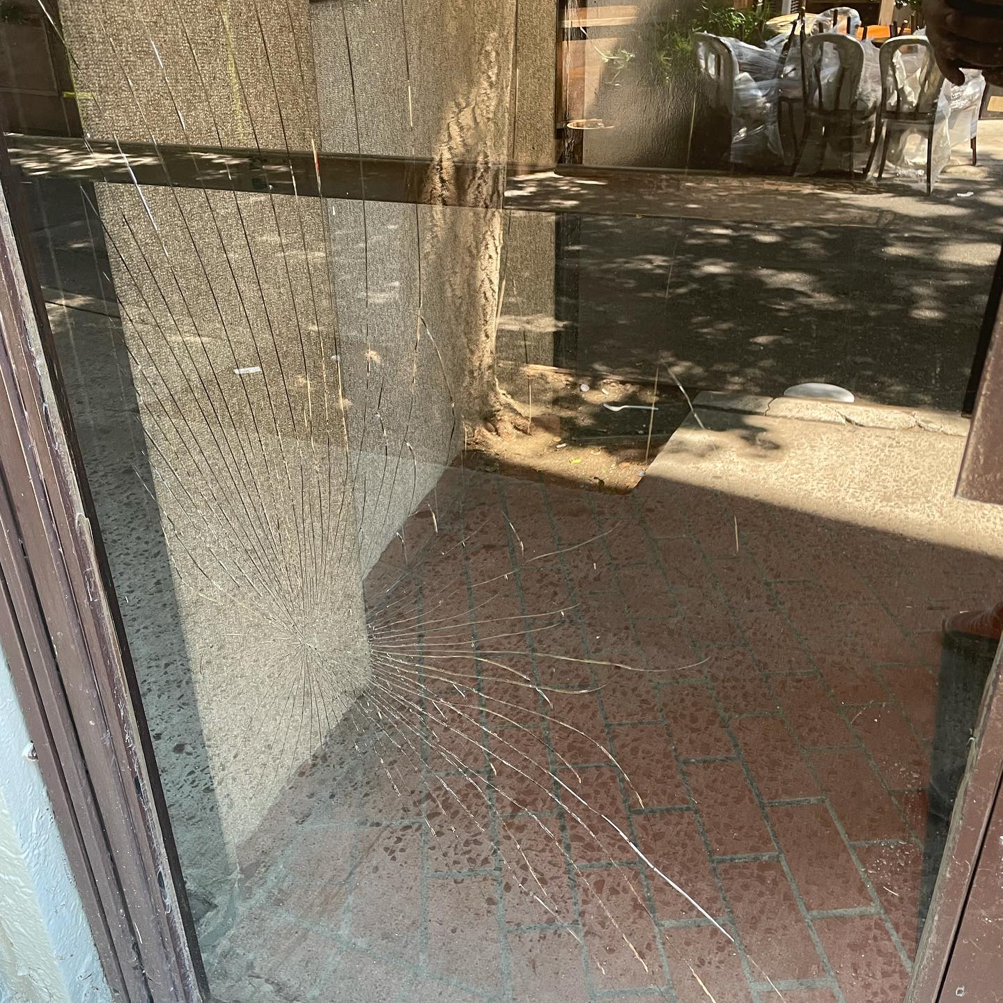 Most commonly caused when someone kicks or throws something at a storefront or commercial door.